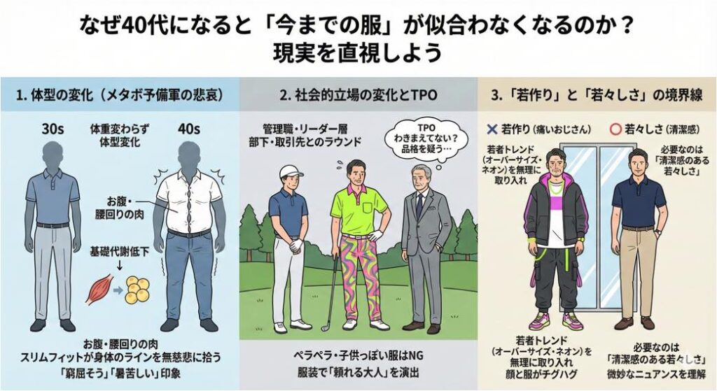 まずは、私たちが直面している現実を直視することから始めましょう。 40代になると、なぜ急にウェア選びが難しくなるのでしょうか。それには明確な理由があります。