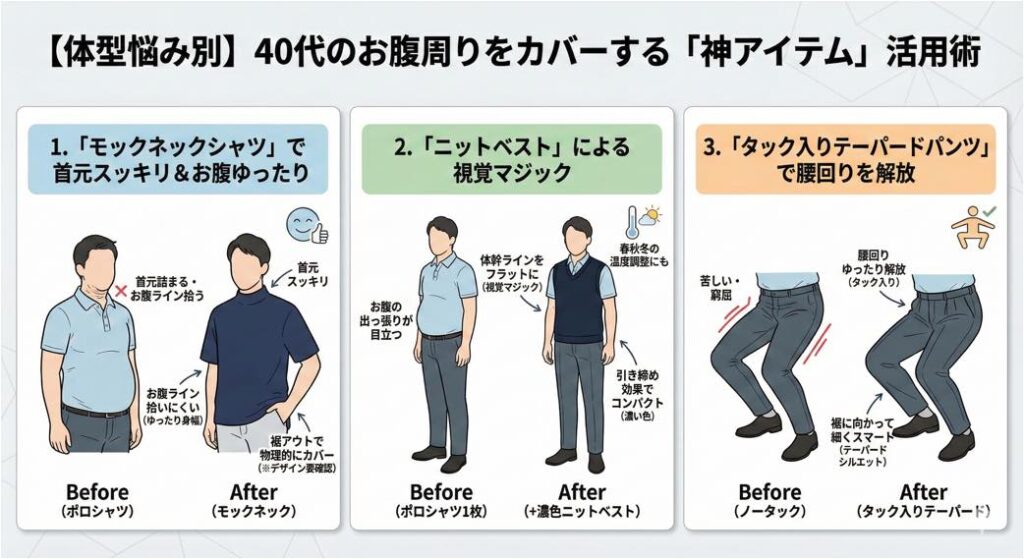 ブランドが決まったら、次は具体的なアイテム選びです。 40代最大の敵である「ぽっこりお腹」や「だらしない背中」を隠し、スタイルアップして見せるためのテクニックをご紹介します。