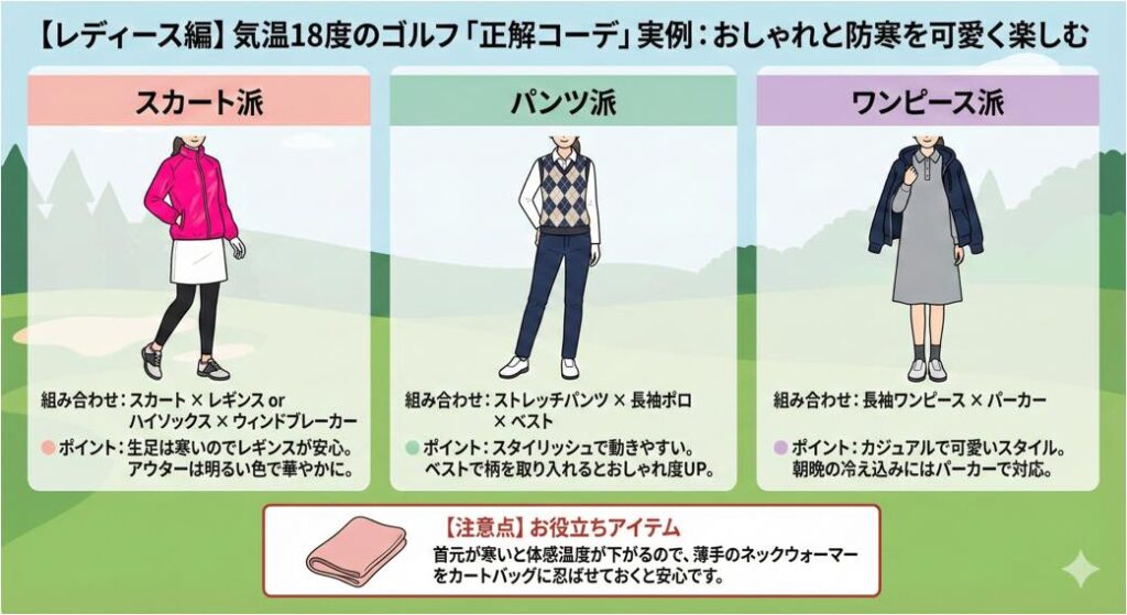 つまり、18度のゴルフにおける服装の鉄則は、**「暑さと寒さの両方に対応できる調整力」**を持つことなのです。