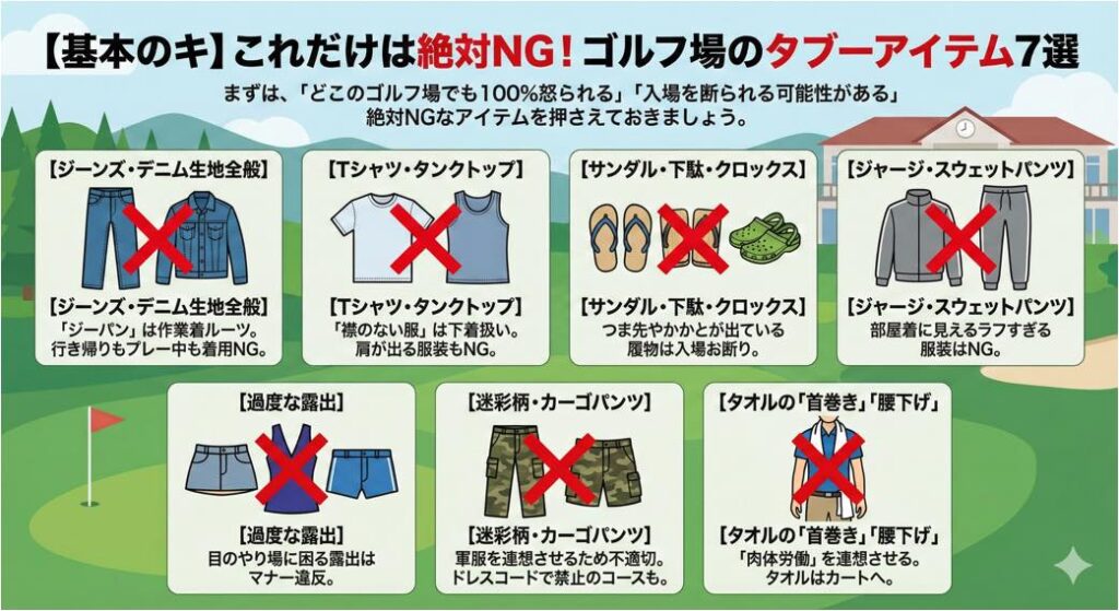 - 事前準備: 必ずそのゴルフ場の公式サイトにある「ドレスコード」のページを確認してください。写真付きでNG例が載っています。