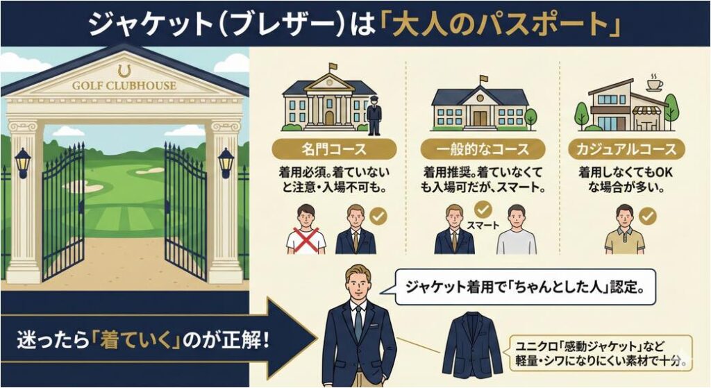 日本の多くのゴルフ場では、入場時に「ジャケット(またはブレザー)の着用」を求めています。