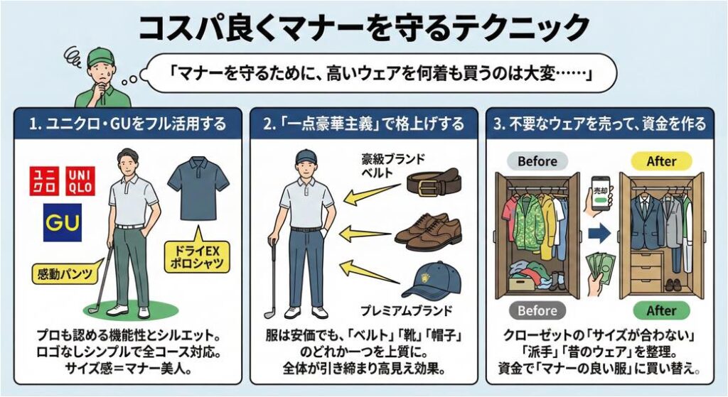 「マナーを守るために、高いゴルフウェアを何着も買うのは大変……」 そう思う方も多いでしょう。ここでは、お財布に優しく、かつ好印象を与えるテクニックを紹介します。