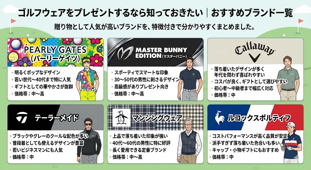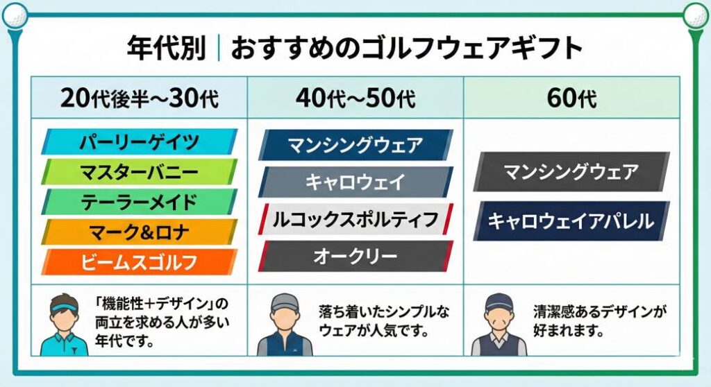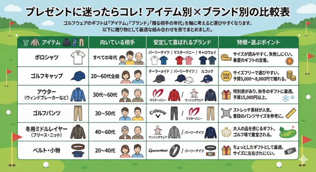 ゴルフウェアのギフトは「アイテム」「ブランド」「贈る相手の年代」を軸に考えると選びやすくなります。