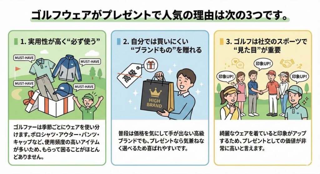 ゴルフウェアがプレゼントで人気の理由は次の3つです。