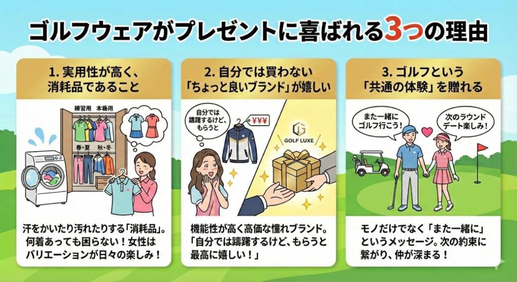 アクセサリーやバッグなど、女性へのプレゼントの選択肢は無限にあります。その中で、あえて「ゴルフウェア」を選ぶメリットはどこにあるのでしょうか。